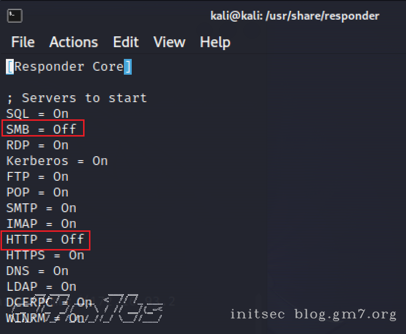 然后再修改responder的配置文件Responder.conf,关闭HTTP和SMB服务,修改后启动,启动的目的是因为responder支持LLMNR,ntlmreplayx不支持LLMNR,开启后responder会将监听到的LLMNR的Net-NTLM Hash自动转发到SMB服务上,相当于对 ntlmreplayx 进行增强。