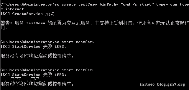 sc create testServ binPath= "cmd /c start" type= own type= interact