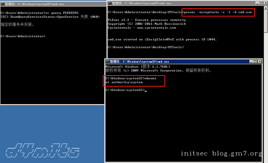 -accepteula隐藏psexec第一次运行时弹出的提示是否许可执行的窗口-ssystem权限运行-i交互式-d执行命令后返回,不等待命令结束
