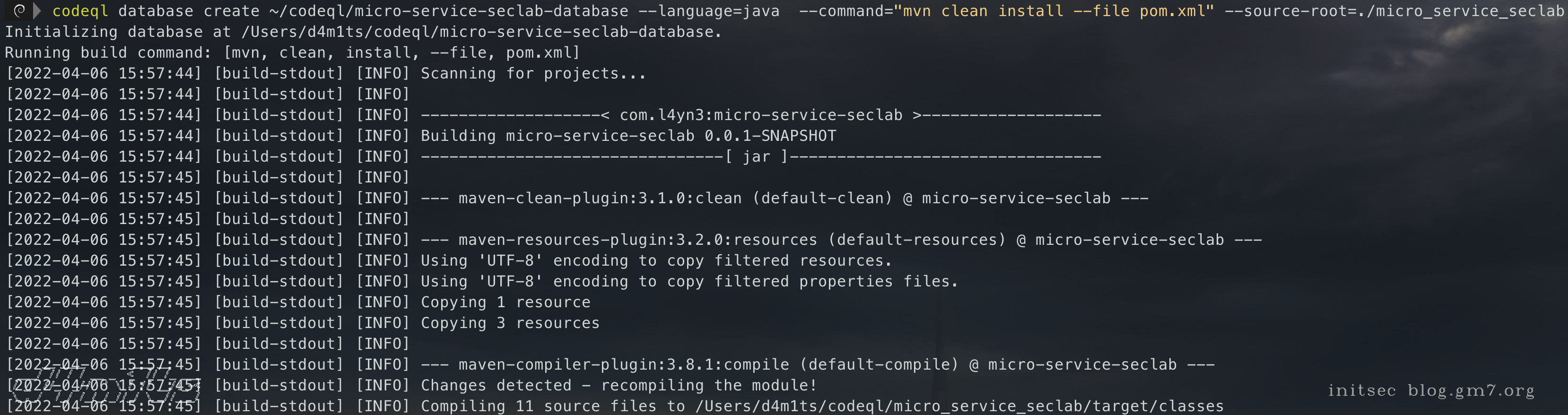 codeql database create ~/codeql/micro-service-seclab-database --language=java --command="mvn clean install --file pom.xml" --source-root=./micro_service_seclab