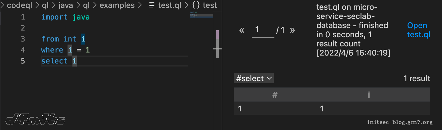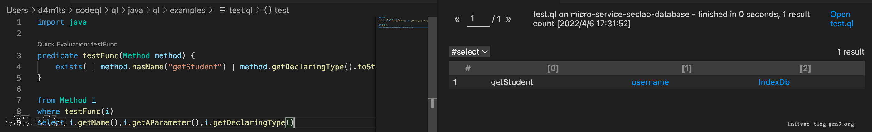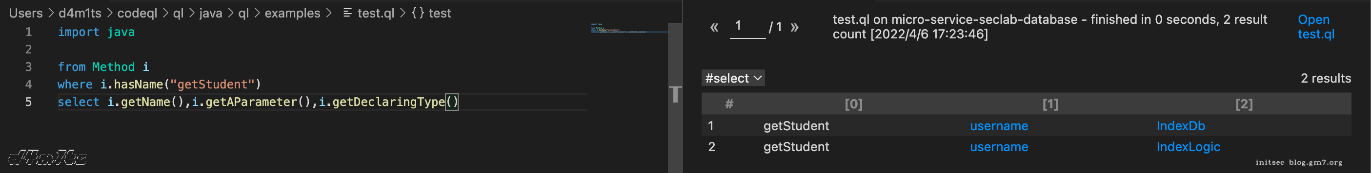 在~/codeql/ql/java/ql/examples/test.ql中编写测试代码,因为examples目录下有qlpack.yml就不需要再新建了。