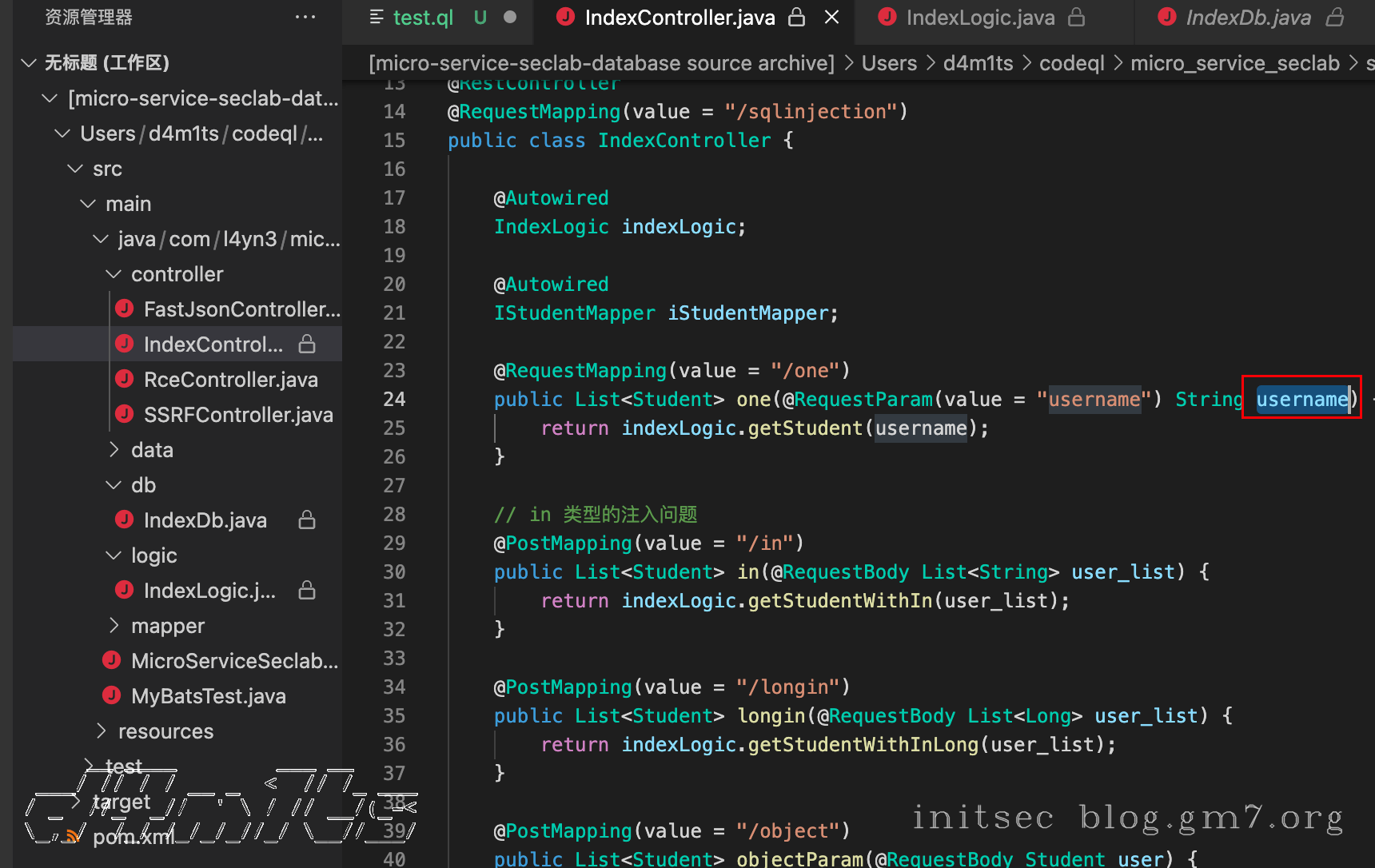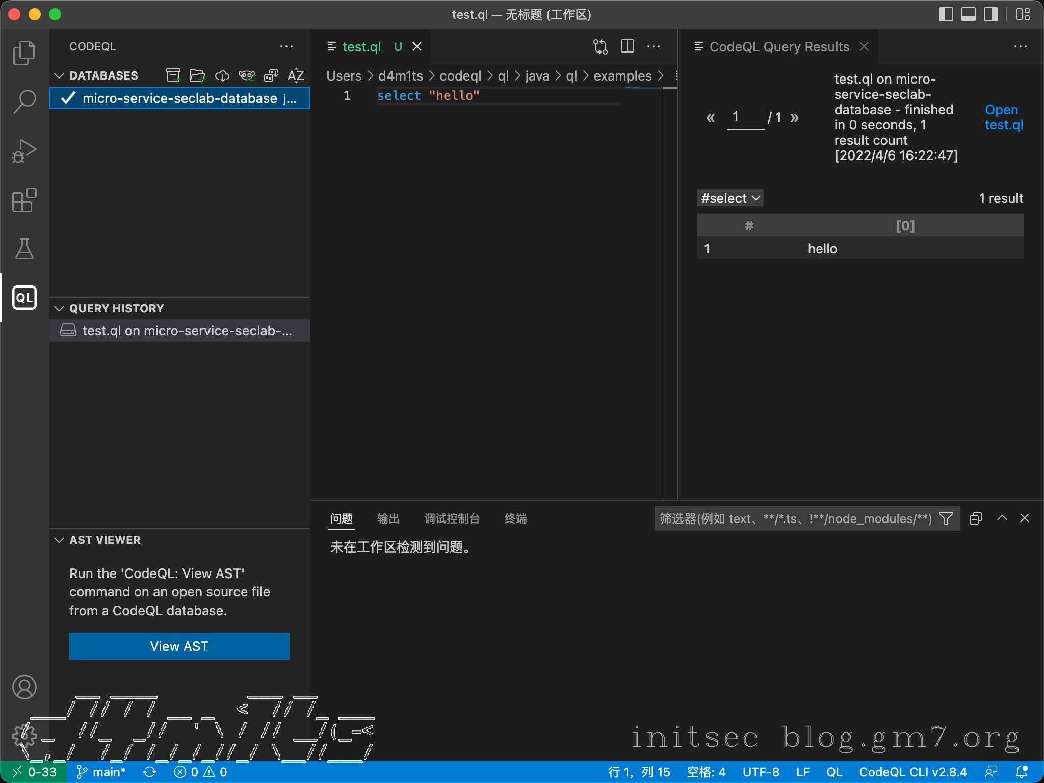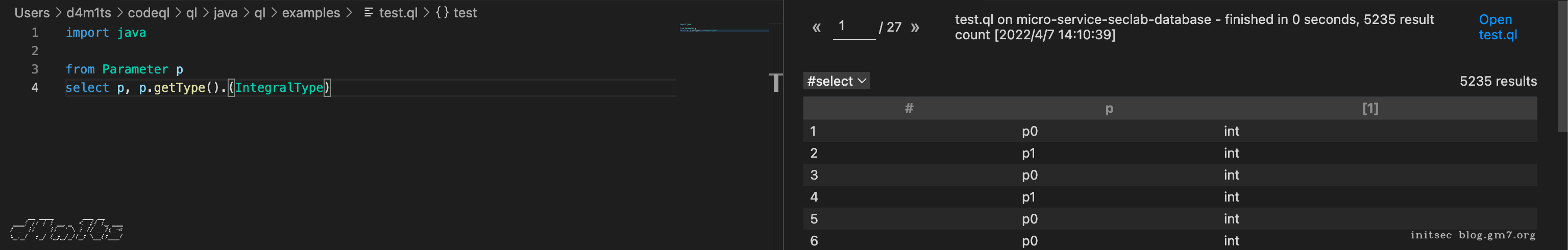在~/codeql/ql/java/ql/examples/test.ql中编写测试代码,因为examples目录下有qlpack.yml就不需要再新建了。