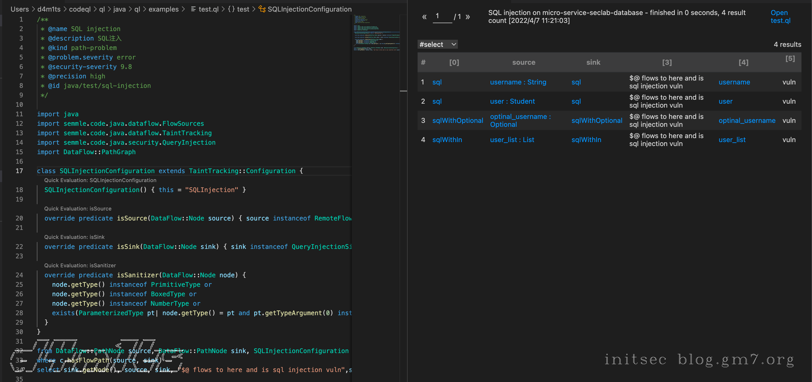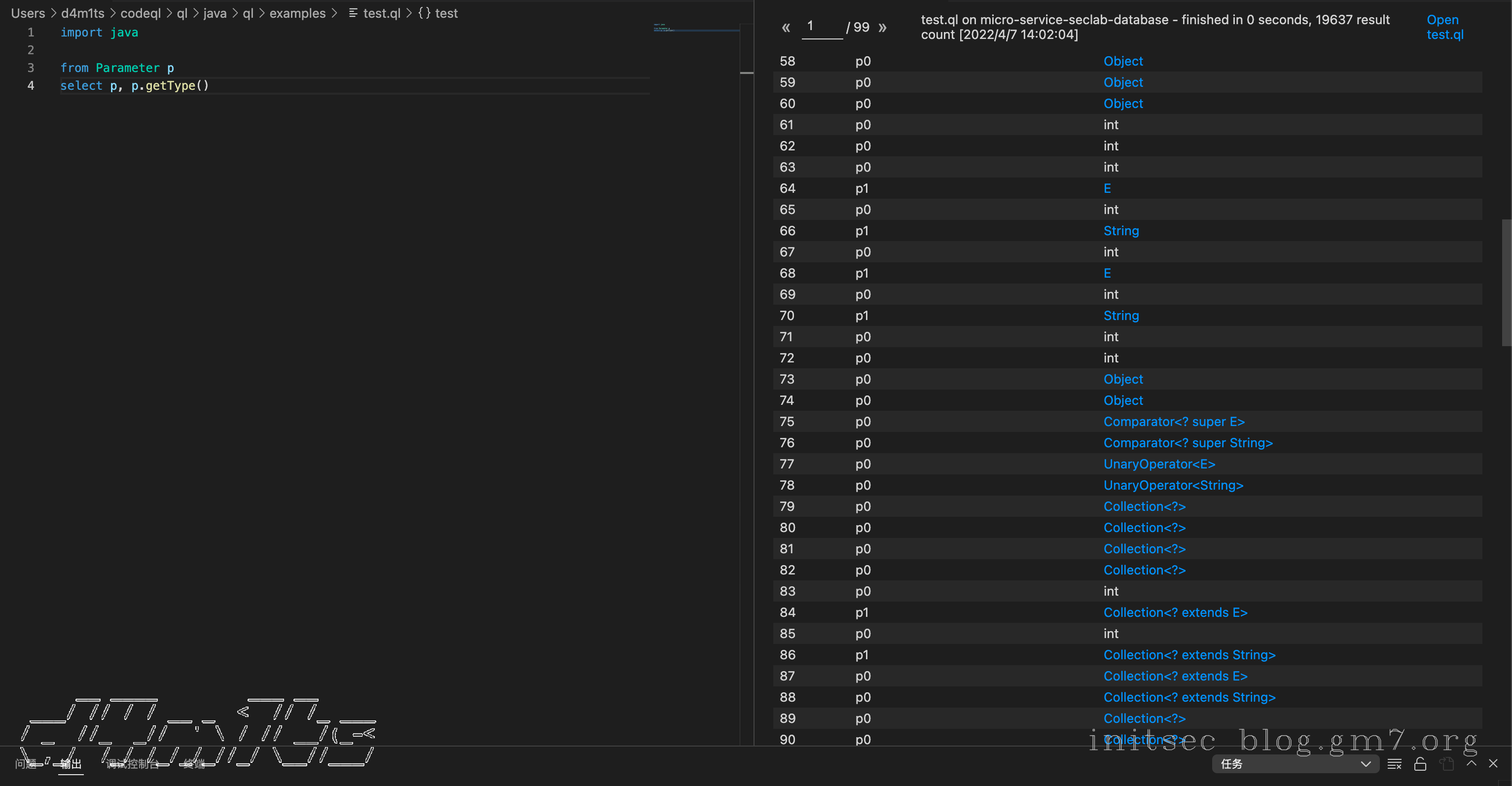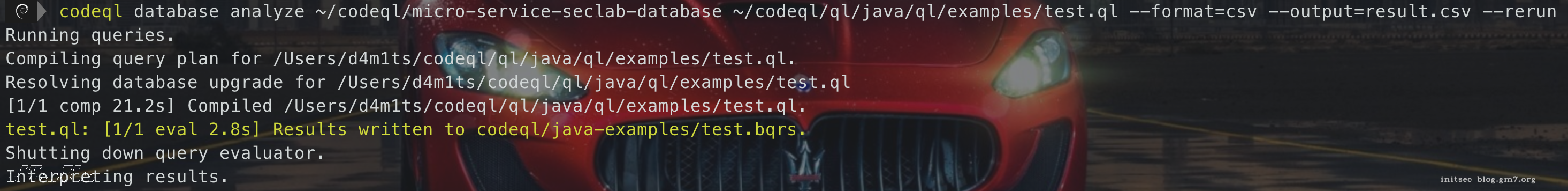 codeql database analyze ~/codeql/micro-service-seclab-database ~/codeql/ql/java/ql/examples/test.ql --format=csv --output=result.csv --rerun