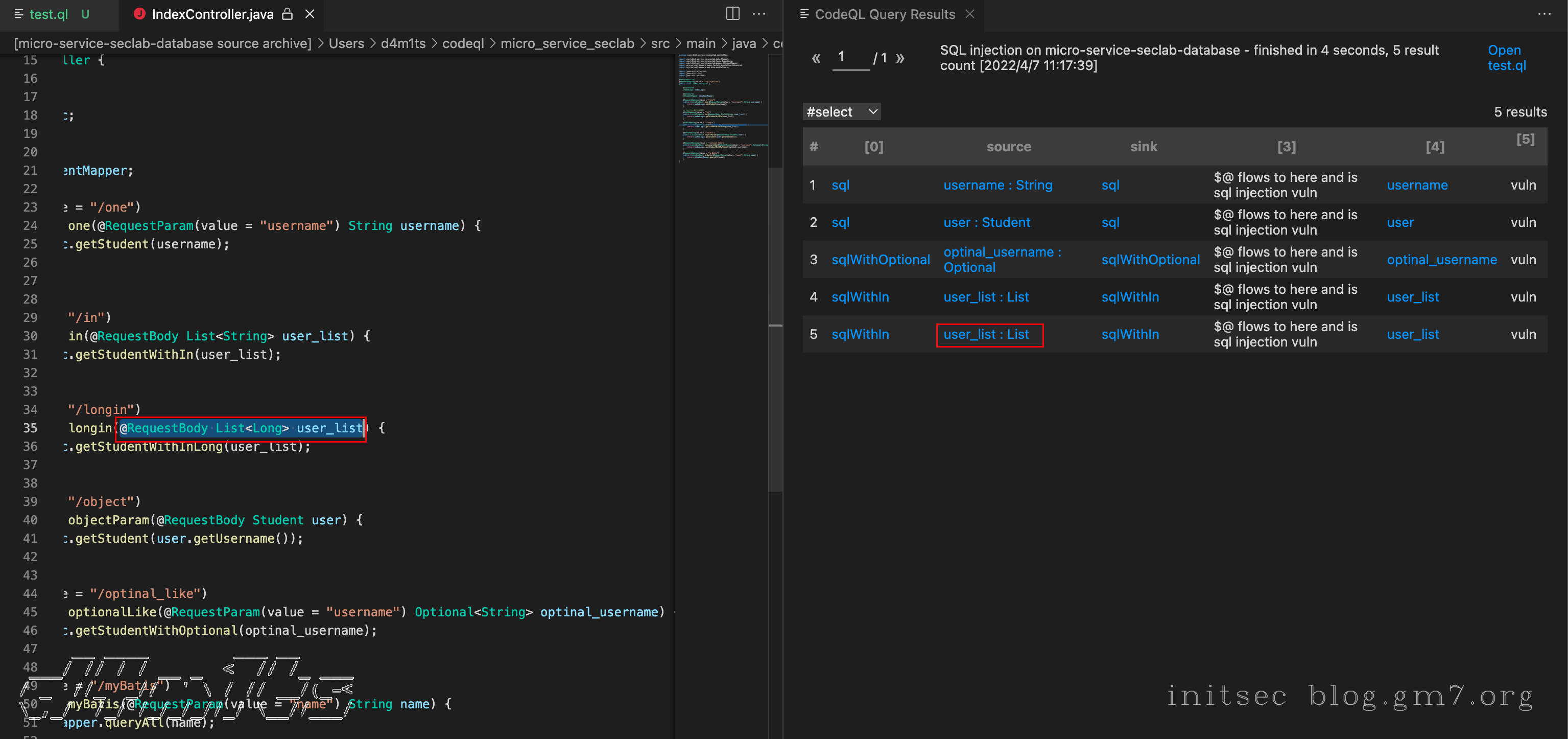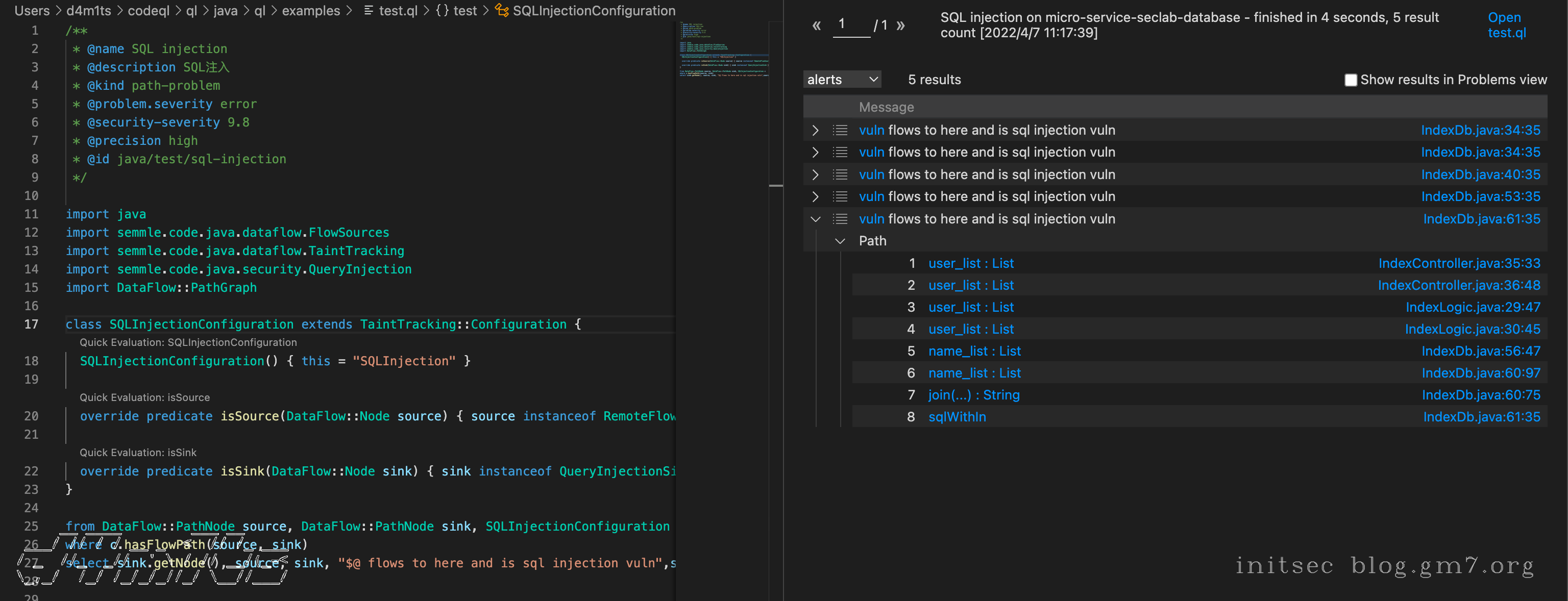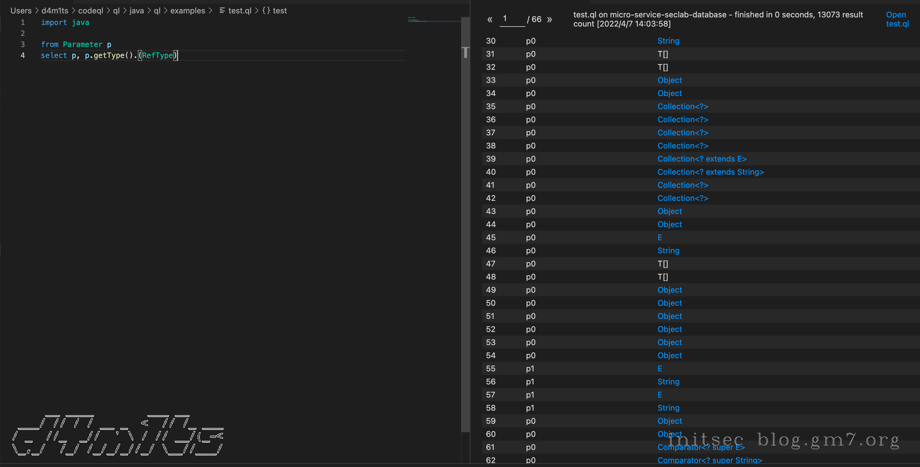 codeql database analyze ~/codeql/micro-service-seclab-database ~/codeql/ql/java/ql/examples/test.ql --format=csv --output=result.csv --rerun