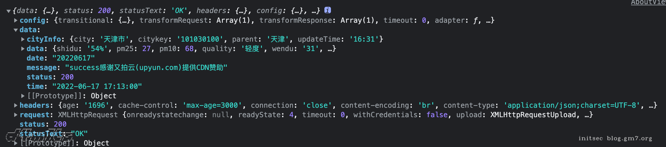 以某天气API http://t.weather.sojson.com/api/weather/city/101030100 为例,如果直接本地用axios发起get post请求,肯定是拿不到数据的,因为有CORS策略的限制。