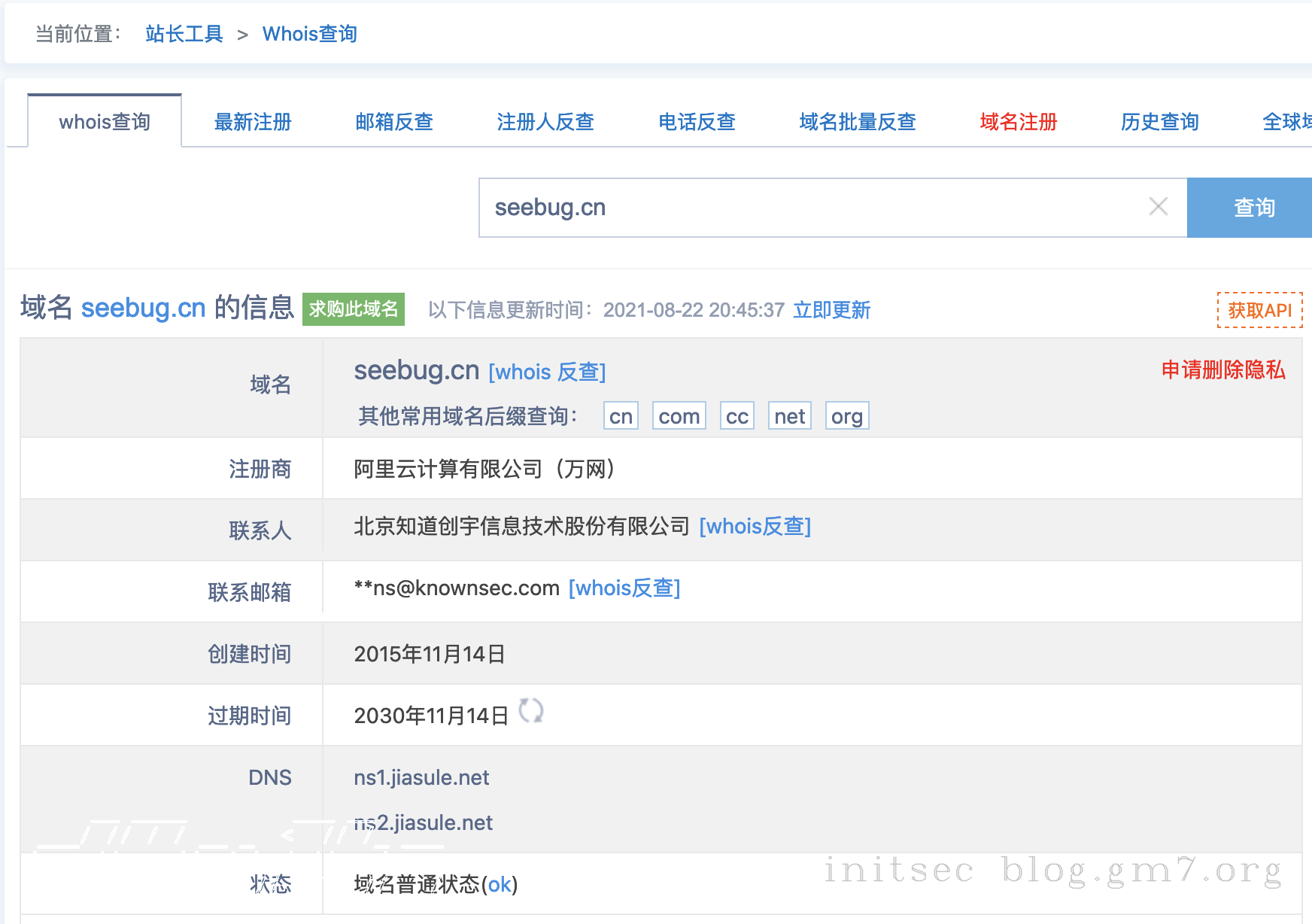 通过查询目标的WHOIS信息,对联系人、联系邮箱等信息进行反查,获取更多相关的域名信息。